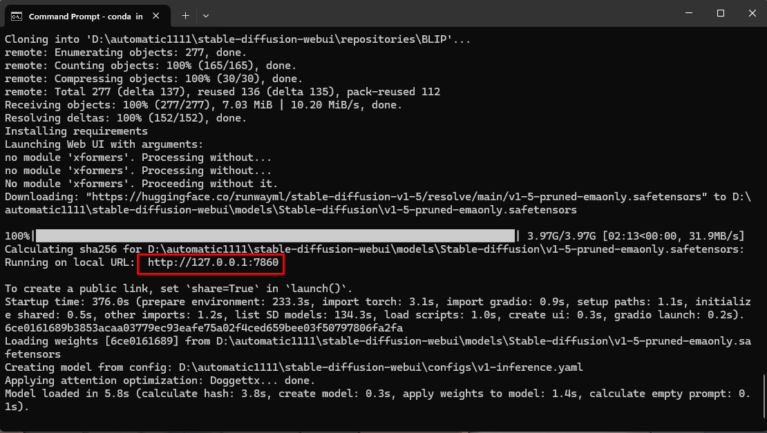 6. หากทุกอย่างถูกต้องจะมีข้อความ “Running on local URL: http://127.0.0.1:7860“