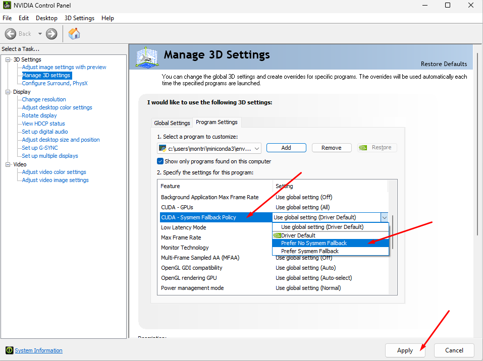 11. ให้หา “CUDA - System Fallback Policy” และเลือก “Perfer No System Fallback” จากนั้นกด Apply เป็นอันเสร็จสิ้น