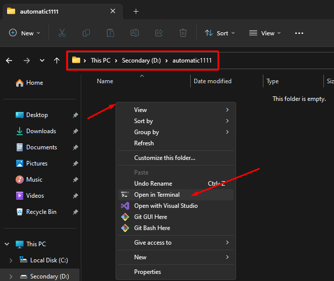 3. เปิด File Explorer ไปที่ Folder ที่ต้องการติดตั้ง คลิกขวาแล้วเลือก “Open in Terminal” หรือเปิด cmd แล้ว cd ไปที่ Folder ที่ต้องการติดตั้ง