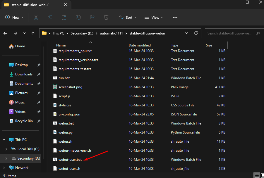 5.1.2 เปิดใช้งาน Stable Diffusion WebUI โดยการ Double Click ที่ไฟล์ webui-user.bat