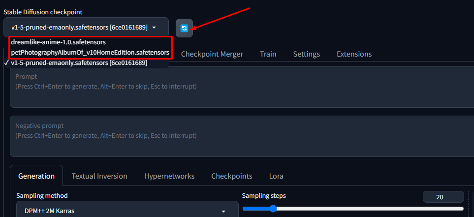2. เปิดเว็บ Stable Diffusion WebUI แล้วกด Refresh ที่มุมซ้ายบนจะเห็น Model ที่เพิ่มเข้าไป