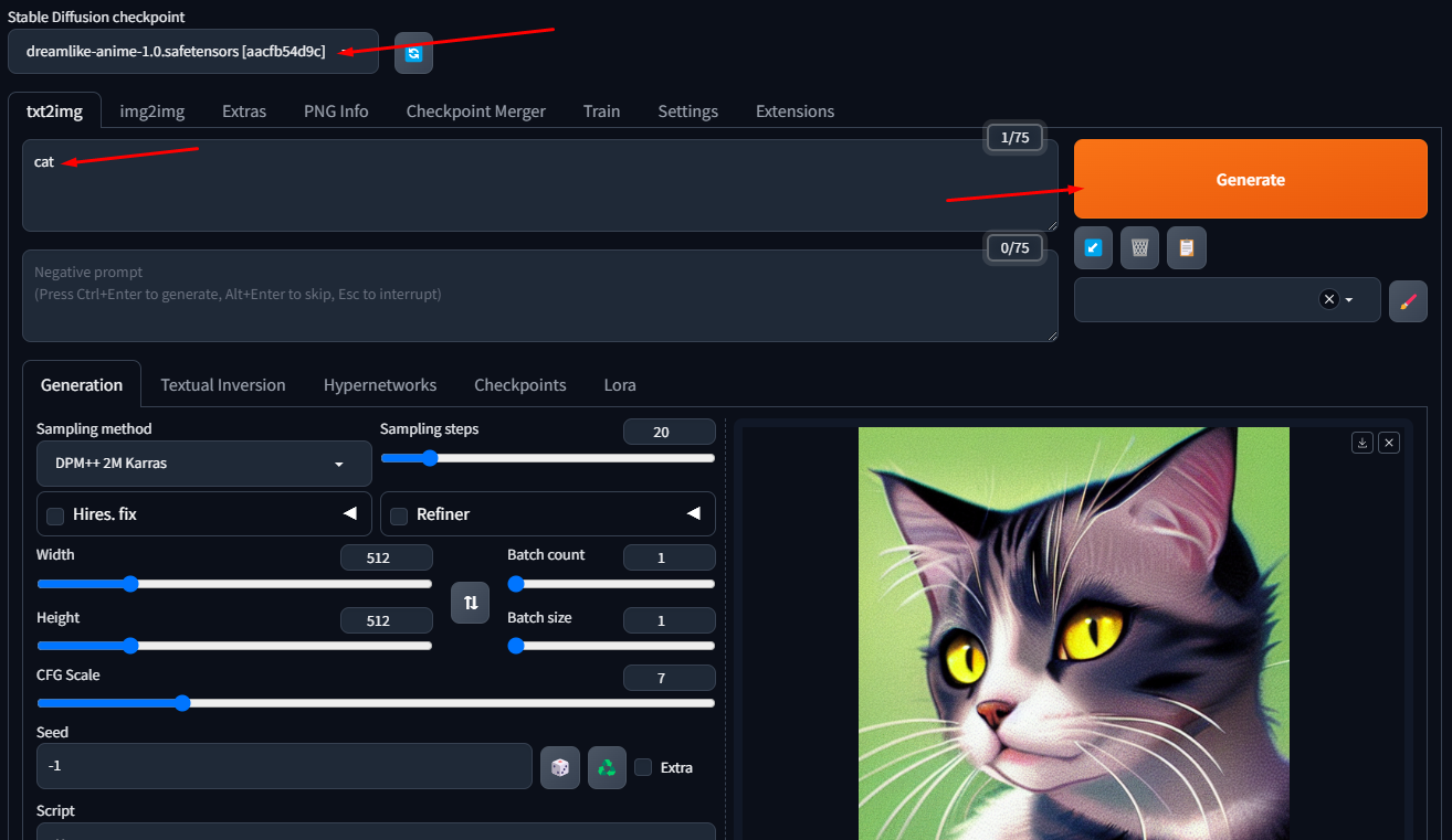 3. ทดสอบ Generate ภาพจาก Model ที่เพิ่ม ตัวอย่างจะเห็นได้ว่าภาพจะออกแนว anime มากขึ้นเพราะใช้ model anime