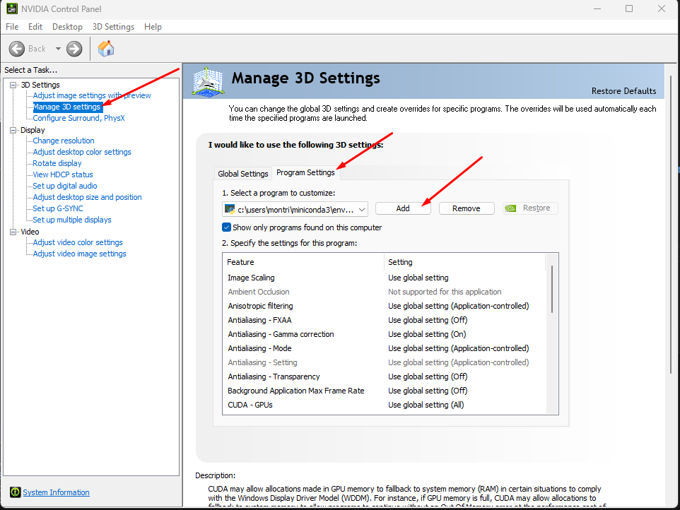 9. ไปที่ Manage 3D settings ทางด้านขวา และไปที่ Program Settings แล้วกด Add