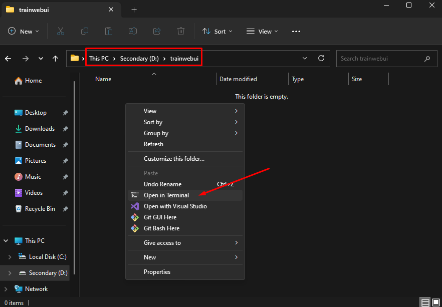 3. เปิด File Explorer ไปที่ Folder ที่ต้องการติดตั้ง คลิกขวาแล้วเลือก “Open in Terminal” หรือเปิด cmd แล้ว cd ไปที่ Folder ที่ต้องการติดตั้ง