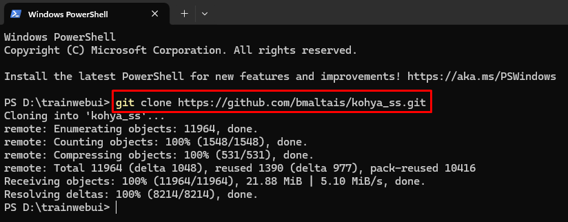 4. ใช้คำสั่งด้านล่างเพื่อ Download Kohya’s GUI