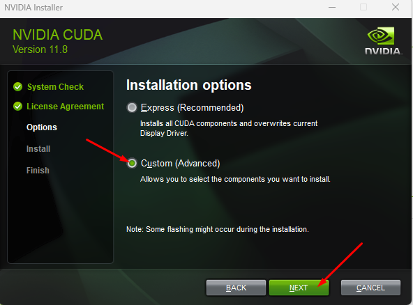 6. ในขั้นตอนติดตั้งให้เลือกติดตั้งแบบ “Custom (Advanced)” และติดตั้งเฉพาะ “CUDA/Development” และ “CUDA/Runtime/Libraries” เท่านั้น