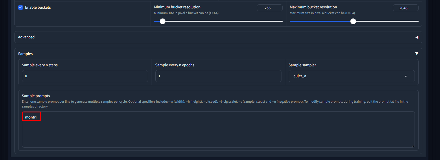 16. ในส่วนของ Parameters -> Samples -> Sample prompts ให้ใส่ keyword ที่เราเทรนเพื่อ generate ภาพตัวอย่างในแต่ละ epochs