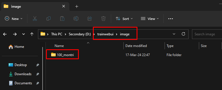 2. ใน Folder image ให้สร้าง Folder ชื่อ “100_keyword” ในตัวอย่างนี้คือ “100_montri” เลข 100 คือจำนวนครั้งที่จะเทรนในแต่ละรูป